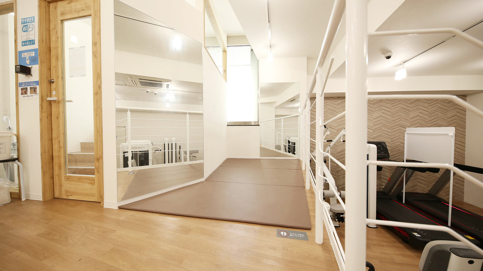 スペースとしてはやや狭いですが、正面鏡張りでマットが敷かれています。