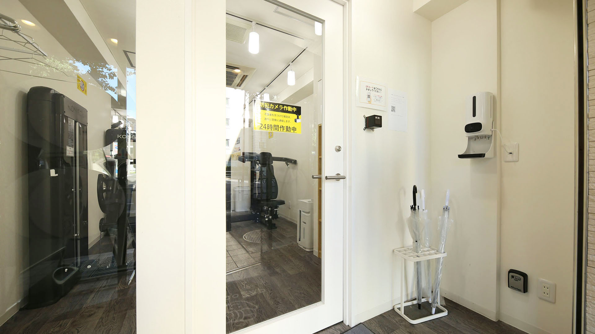 写真右側に見えるQRコードリーダに、携帯のアプリで表示されたQRコードをかざして入室します。