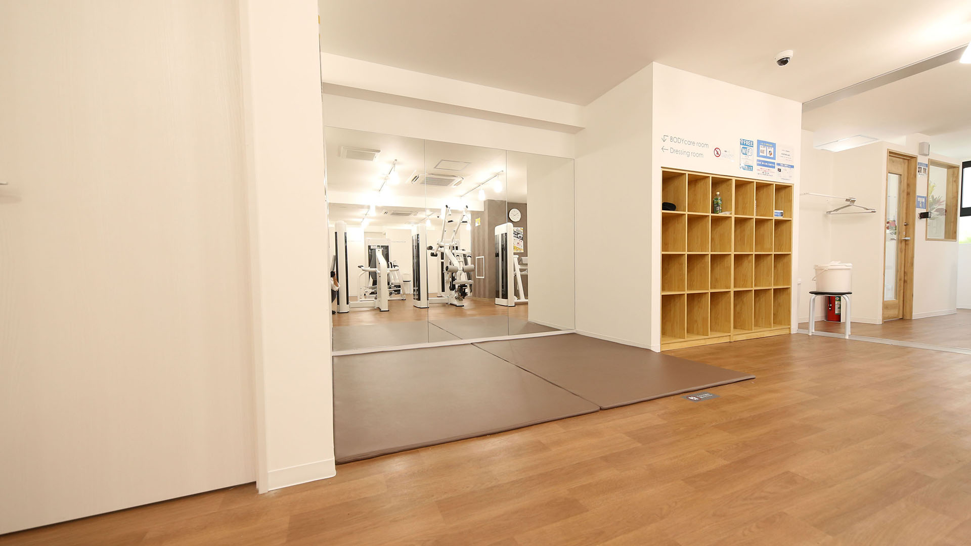 スペースとしてはやや狭いですが、正面鏡張りでマットが敷かれています。